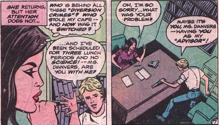 Meanwhile, the mystery of her cape continues to plague Linda's thoughts even when she is at work. This is one of the things that always endeared me to Supergirl. Her life isn't easy. She has to juggle all her responsibilities and it isn't easy. She isn't always successful. It makes her much easier to relate to than Superman who seemed to be able to juggle his Earth, galaxy, universe, and WGBS responsibilities without breaking a sweat.