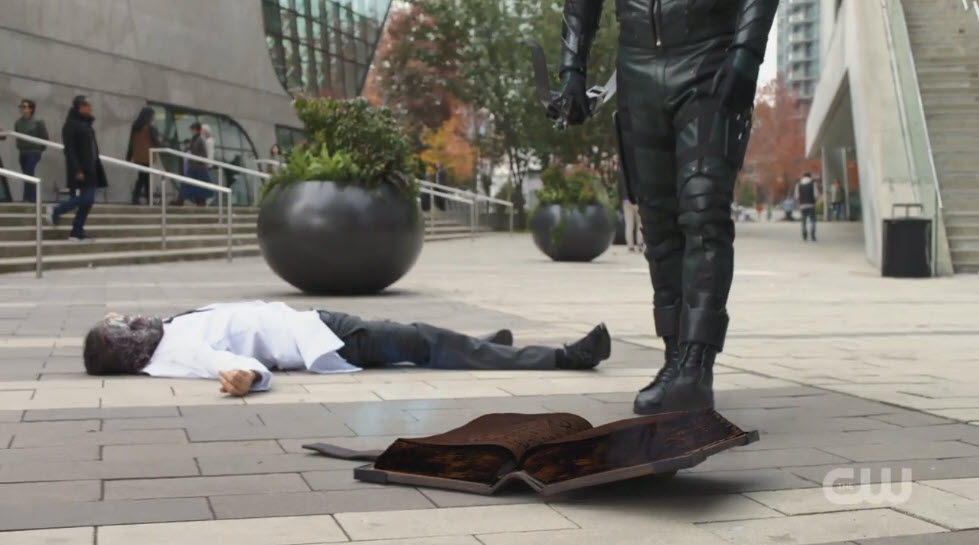 Ollie rushes to hold Diggle and Caitlyn off so Kara and Barry can find the book. But when she gets the book, Kara can't read it.