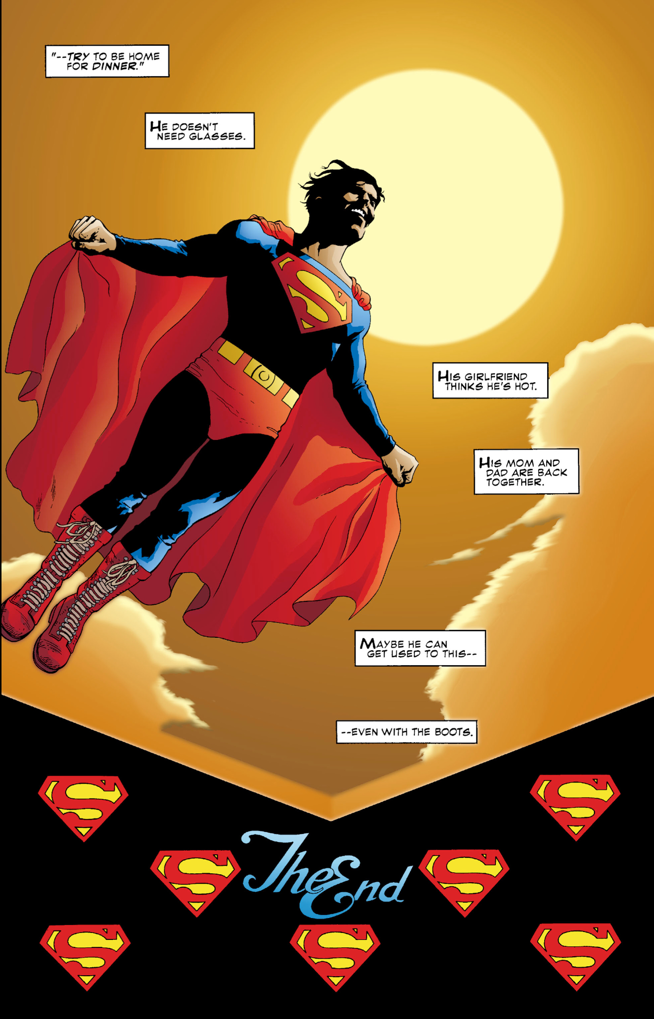 The whole series was really good and it seems that out of the entire comment section of the blog, in all my years here, I'm the only guy who liked that elseworld. Ah well. I liked the ending as well, a masterful passing of the torch and the passing of the times and one of the very few times Clark felt physically human which is something I liked. He might be Earth's Superman but he's also Smallville's Clark Kent and Krypton's Kal-El and those last two are very vulnerable physically and would have probably liked to take it easier after they had a kid, just like both their dads did. It's a nice nod. It's not the Superpowers and super stamina that make Superman, it's the convinction and the strong morals and that's what's passed on to the next generation with John. Even with those boots.